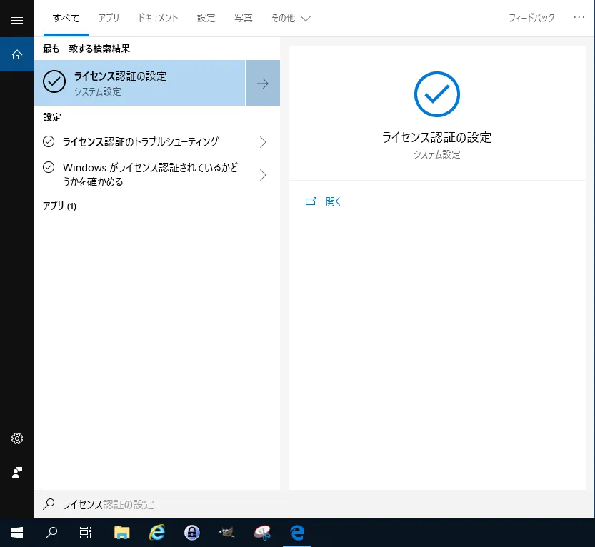 スタートメニューから「ライセンス認証」と検索し、「ライセンス認証の設定」をクリックします。