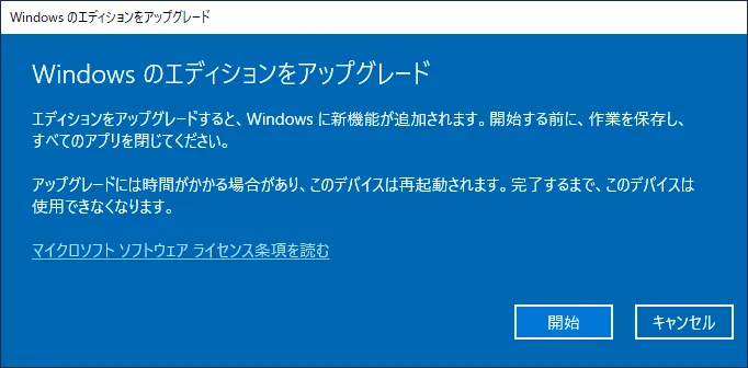 作業を全て終了し、「開始」ボタンを押せば完了です。自動的に再起動し、30 分程度でアップグレードが完了するはずです。